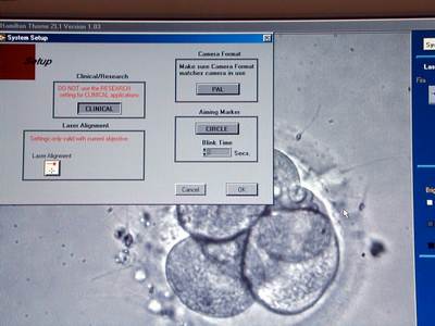 mikroszkóp fölé görnyedve dolgozni, az embrió a monitoron kivetítve látszik.